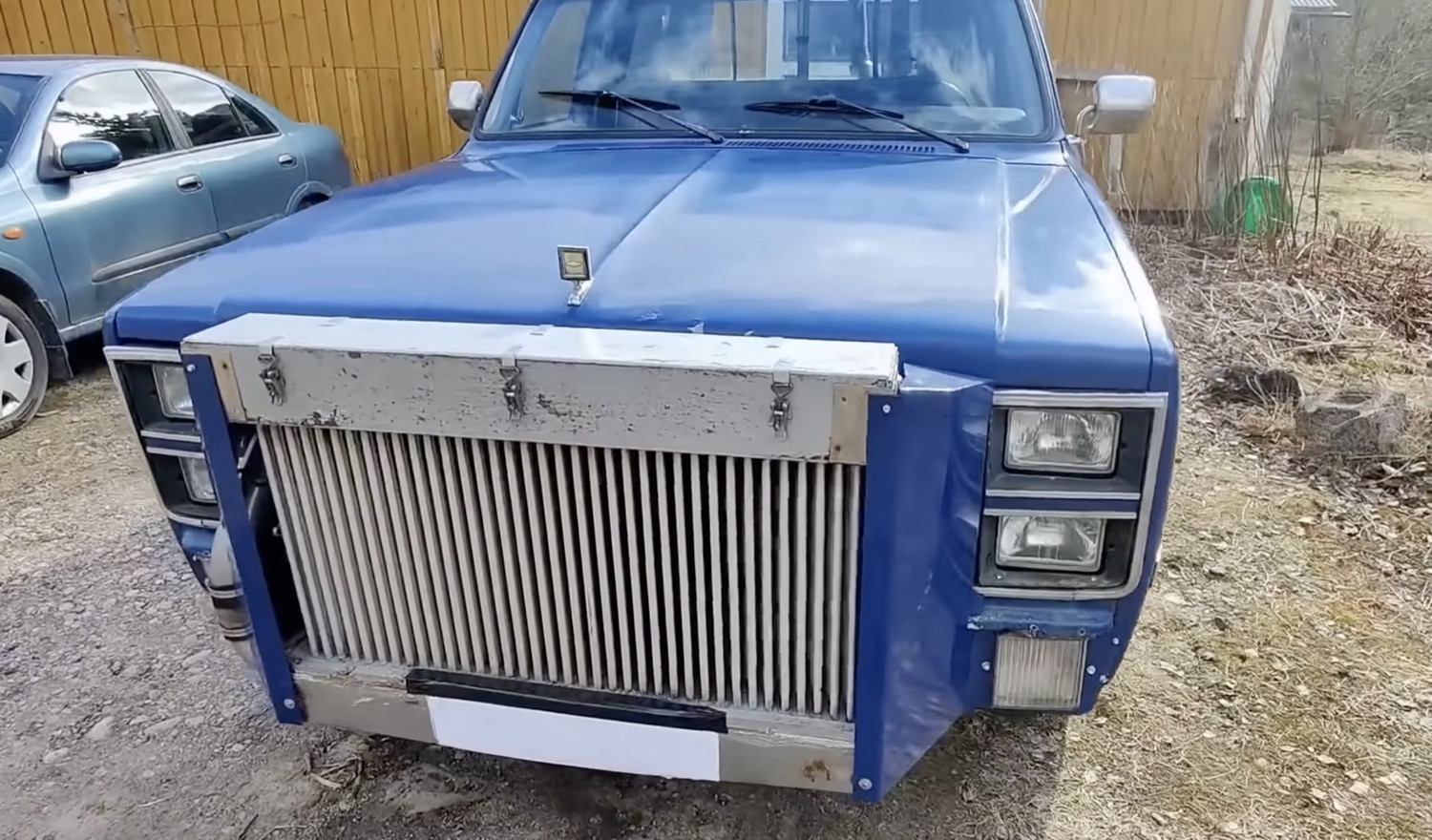 The engine in question was a 1972 350 V8, which had been modified to use a combustible gas mixture. The compression ratio now stands at 11.0:1, while the owner has installed a revised camshaft and new intake manifold to get things working, plus a huge cooling system up front that cools the gasified wood before it enters the cylinders.