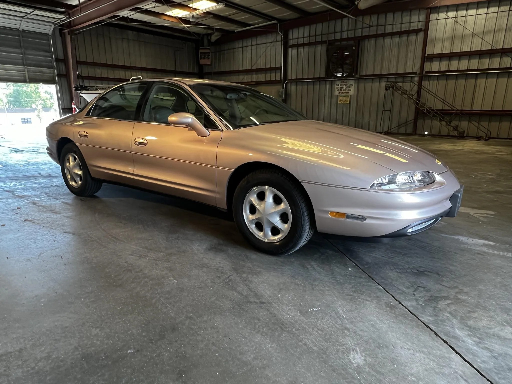 The exterior is presented in Champagne Metallic (color code 83), a period-appropriate color that emphasizes Aurora’s clean design. Oldsmobile eschewed the boxy shape of its previous sedans, instead adopting a rounded cabin-front profile with minimal ornamentation without the “Oldsmobile” branding. Details include integrated fog lights, illuminated window surrounds, and power-adjustable heated mirrors. A factory sunroof adds to the upscale feel. Six-spoke 16-inch alloy wheels wear Michelin tires, and the car retains anti-lock braking with four-wheel discs and traction control.