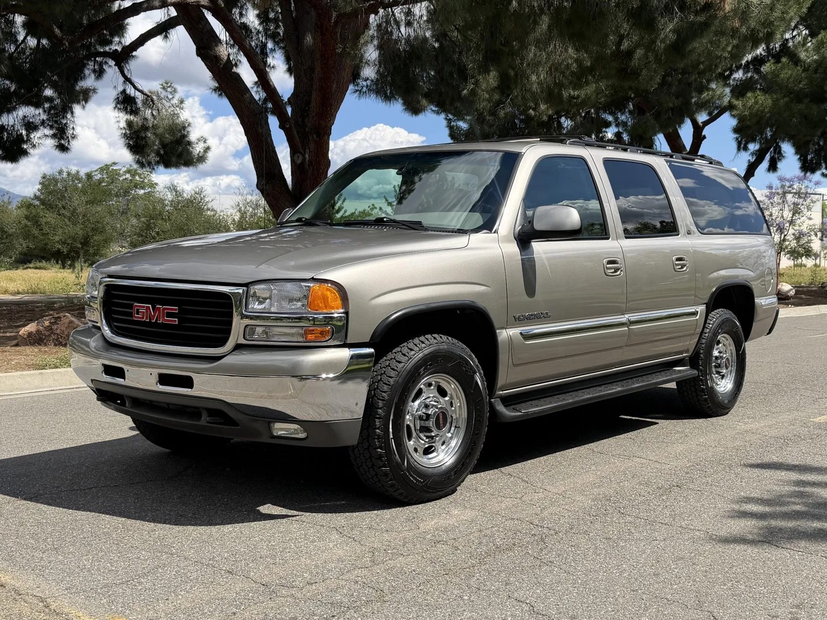The exterior is finished in Pewter, a typical color for its era, but it appears to be in remarkably clean condition for a 25 year old SUV. Chrome bumpers, black wheel arch trim and running boards reinforce its utilitarian design. Additional features include fog lights, heated mirrors, roof crossbars and a receiver hitch. The seller reports minor damage to the right rear quarter panel, but the newly applied ceramic coating improves the overall presentation. Polished 16-inch forged aluminum wheels ride on new Goodyear Wrangler All-Terrain Adventure tires dated 2025, indicating recent attention to road-readiness.