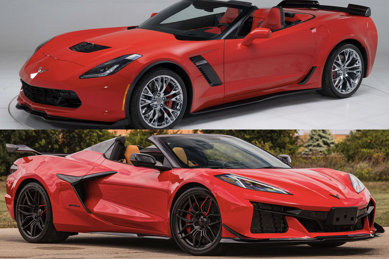 Our 2023 Chevy Corvette Z06 convertible features a finish in Torch Red with a natural leather interior. Having covered just 7,541 miles since new, the Z06 is powered by a 5.5-liter LT6 engine backed by an eight-speed dual-clutch automatic transaxle. Equipment includes the Z06 Ultimate Performance Package, Brembo carbon ceramic disc brakes, PS Cup tires and Z07 suspension, Painted Carbon Flash high wing, carbon fiber dive planes and ground effects, two-stage carbon fiber interior trim, carbon flash painted nacelle and roof, painted carbon flash rearview mirrors, ride height adjustable front lift with memory, Bright Red brake calipers, Graphite Aluminum Spider wheels with Jake logo center caps, dual zone climate control, black exhaust tip, Torch Red seat belts, power steering column tilt/telescopic, heated and cooled seats and electrically heated rearview mirrors. Included in the sale is a laminated copy of the window sticker. The Corvette is being sold with the remainder of the applicable factory warranty.