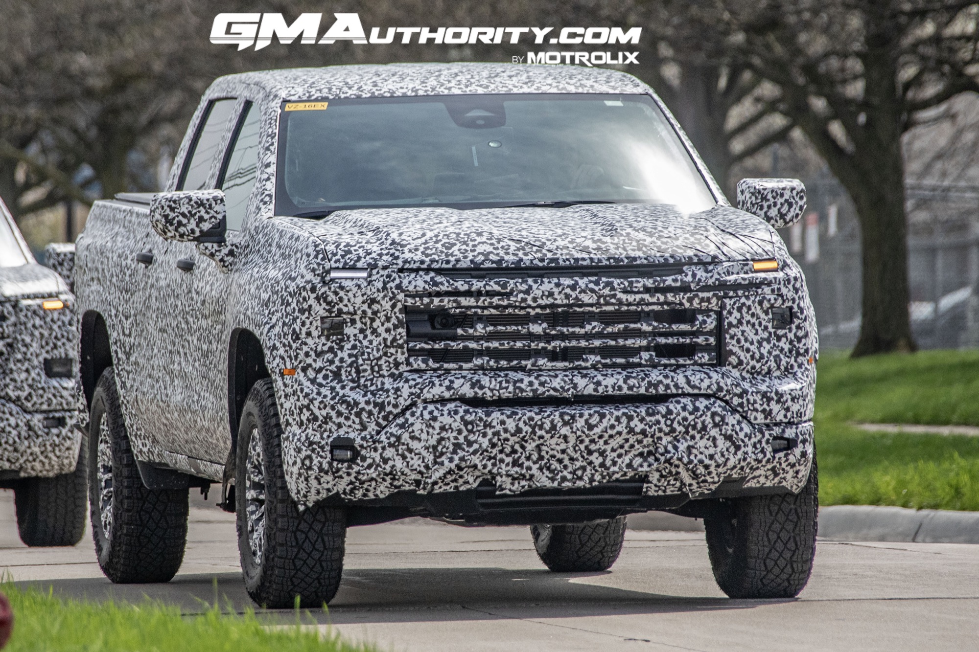 Below, we can clearly see the high-cut front fascia without an air dam, resulting in healthy approach angles and ample clearance. And we can’t see it clearly, but it looks like there’s a skid plate tucked behind the bumper, along with some front tow hooks, covered in camouflage. A set of fog lights adorns the bumper.