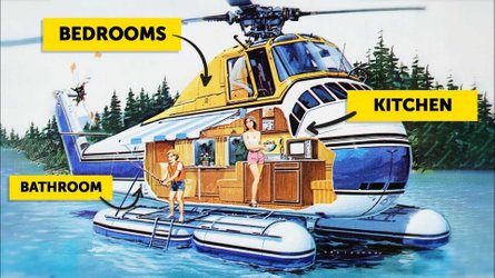 An unconventional camper package hides a very conventional camping experience. Winnebago was able to design a flying camper that contained everything needed for a weekend in the wilderness. Winnebago Helihome features seating and a table that converts into a bed for four, air conditioning, color TV and water heater.